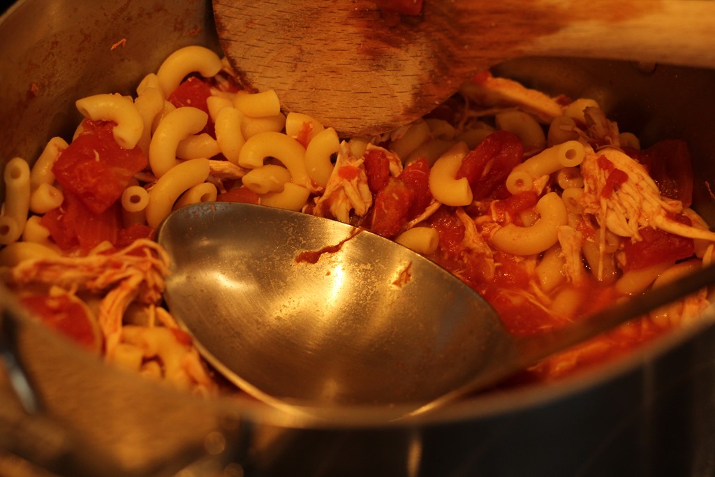I set out to make a soup with some of the food we had just hanging around in the pantry. David bought some fresh chicken, and I threw in some leftover elbow noodles and diced tomatoes. Nothing fancy, but still hearty. And it wasn’t really soup-like; it was more like a stew.