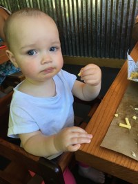 After our walk, which took about an hour or so, we headed in to downtown Concord for lunch at Main Streets Cafe. The restaurant was very busy but we were able to get a table in their lower restaurant, near the bar and the ice cream stand. Service wasn’t terribly quick but it was very friendly and the kids kept us entertained. I had a chicken flatbread sandwich, with provolone cheese and roasted red peppers. Eleanor had some mac and cheese…and she devoured it! She sure loves her carbs. 🙂