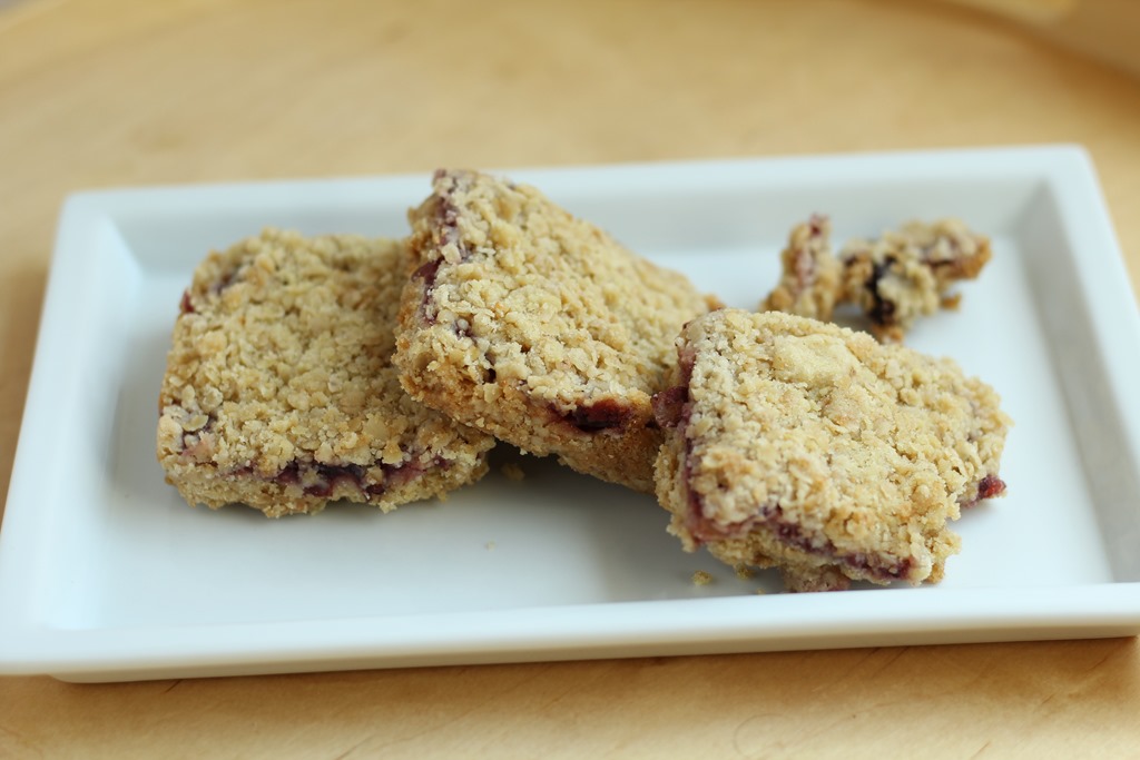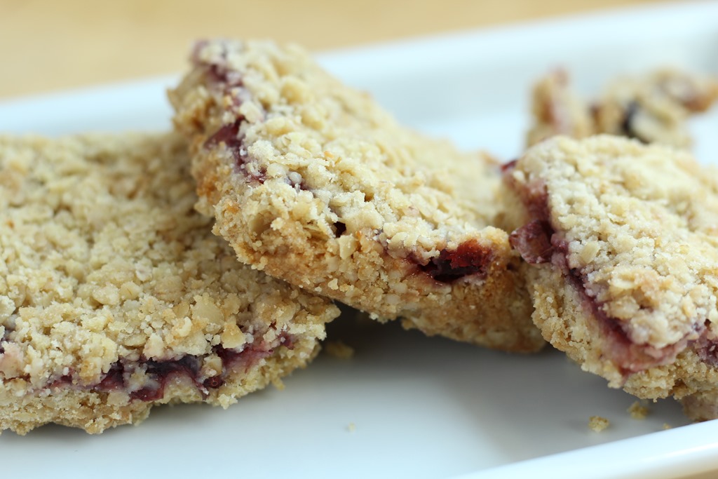 3) Spoon three-quarters of the oat mixture into a 13″x 9″ cake pan. Press down on it firmly to form a firm layer that evenly covers the bottom of the pan. Add the cranberry sauce in dollops and spread it in a thin layer over the oat layer. Sprinkle with the remaining oat mixture.