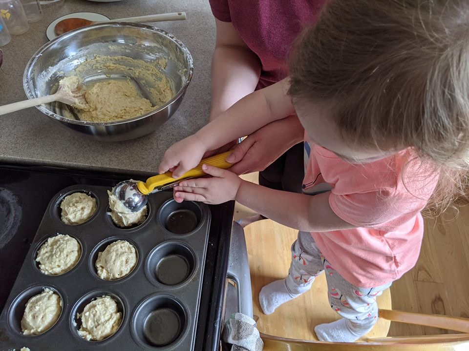 I have to admit, though, it was tough relinquishing control so that she could do “mine-self”. But the flour on the floor and the misshapen scoops didn’t seem as significant when I saw how happy she was at helping me.
