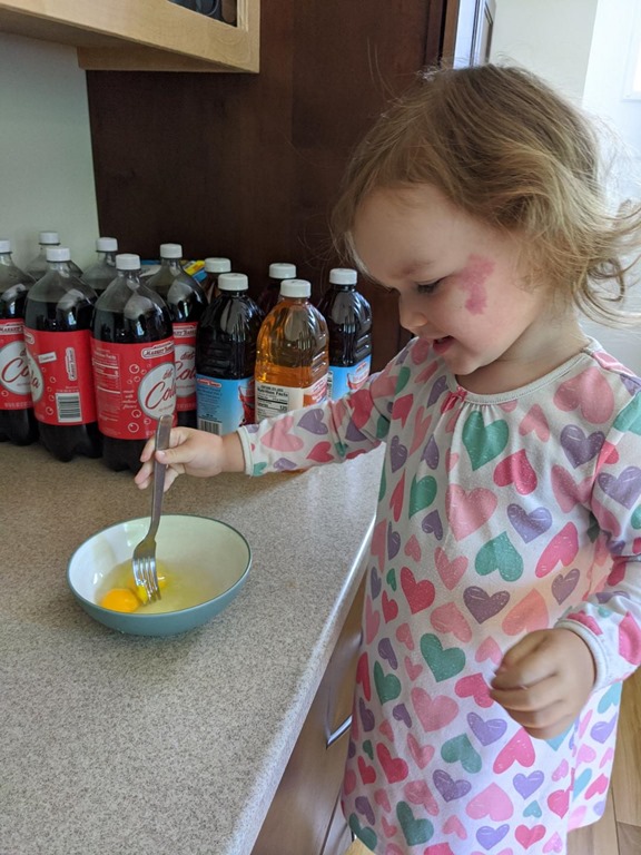 What I try to do, to maintain my composure, is to just tell myself that everything can be cleaned up easily. I used to get nervous about her getting raw ingredients in her mouth but we’ve been making scrambled eggs together recently and she does so well making sure not to touch anything until I can wash her hands.