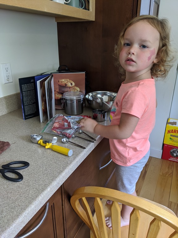 And when she spills the batter over the sides, inside I’m going “ahh, the waste!”. But then I just take a deep breath and realize that she’s only 3, and I need to embrace these times that we spend together. At one point I did snap and it made her cry. Gah, that was not a proud mother moment! I cleaned up a little bit and then I hugged her and told her I was sorry. We went right back to it. And she really is so proud when I tell her she’s doing a good job. ![]()