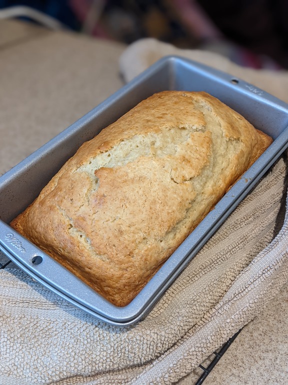 Heat oven to 350 degrees. Grease and flour 9x5x3″ loaf pan. Measure and mix all ingredients in mixing bowl. Beat on medium speed for 1 minute. Bake 55-65 minutes (I did mine at 60 minutes, and I have an electric oven). Done when wooden toothpick inserted comes out clean. Remove from pan. Cool on rack.