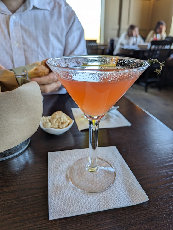 I started with a cocktail, the Dalliance, which is strawberry-thyme vodka, elderflower liqueur, lemon, sparkling wine. It was so refreshing and just the perfect drink to start the evening. We were also presented with some sourdough bread and corn bread…with maple syrup butter! So good!