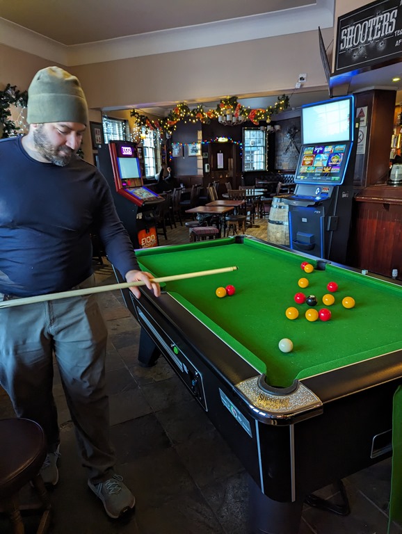 We found a pub on the river where we played some pool and had a pint. You know, at that time (3PM) it was the hardest thing to find some food. Either the place didn’t have a kitchen or they weren’t serving until 5. We were starving after traveling all day, and we finally found a place that was serving: The Auctioneers. David got the fish and chips and I had a chicken sandwich. And oh my gosh, the chips in the UK are the best. They are literally the same at every restaurant and I didn’t mind that at all. They were delicious.