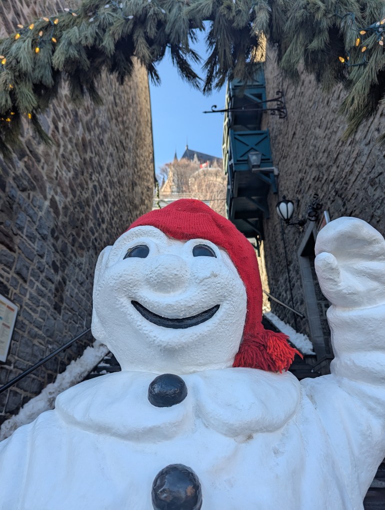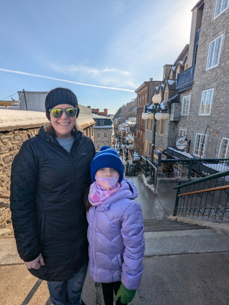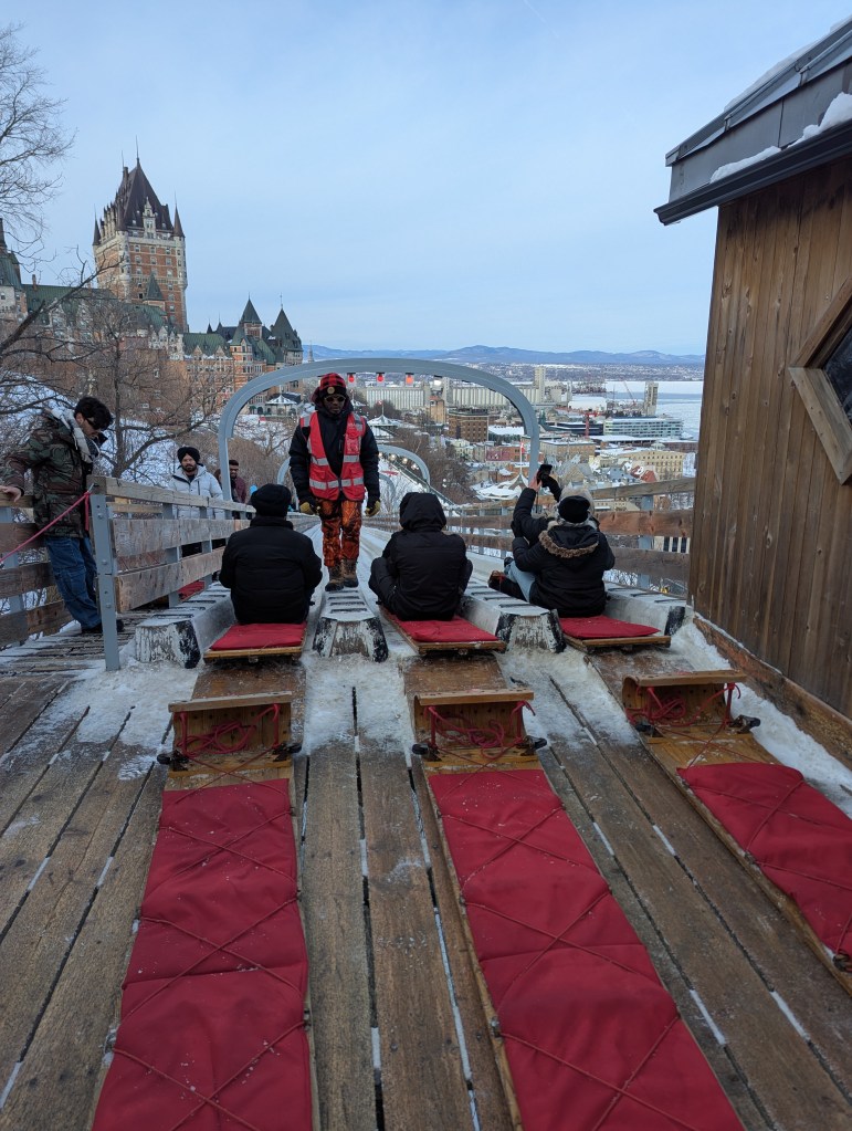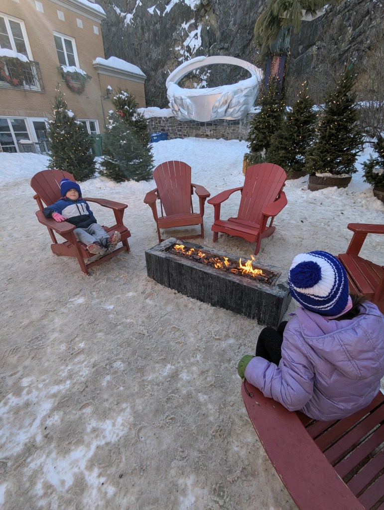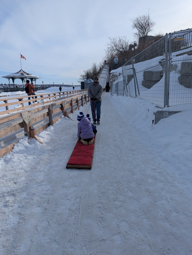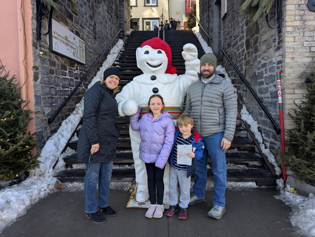 We took the afternoon to walk around Old Quebec, checking out the decorations and small fire pit areas, left over from the Winter Carnival (and posed with the Bonhomme de Neige!). And then we headed over to the base of the Fairmont Chateau Frontenac to ride the Toboggan! This was on the top of my must-do list. David and I both carried up the sled; he rode down with Lincoln and I was with Eleanor. I wanted to take a video of going down, but we were going really fast! It was a lot of fun and I’m so glad we didn’t have to wait hours to get on (only about a 30-minute wait).