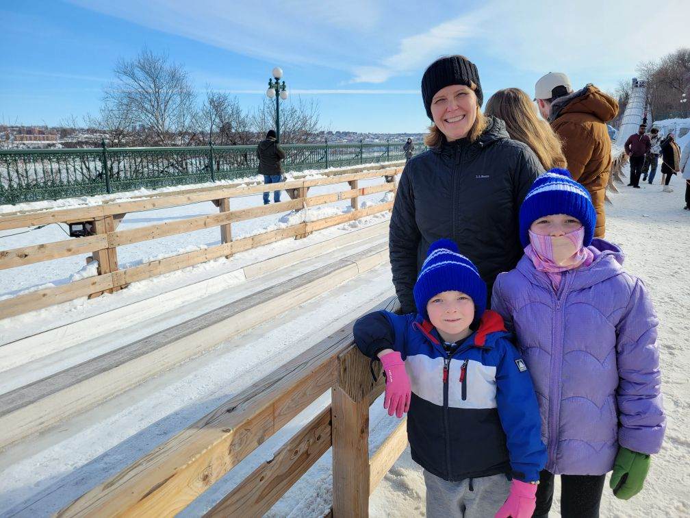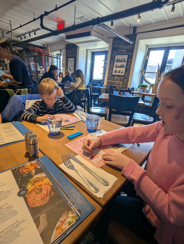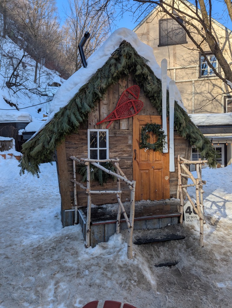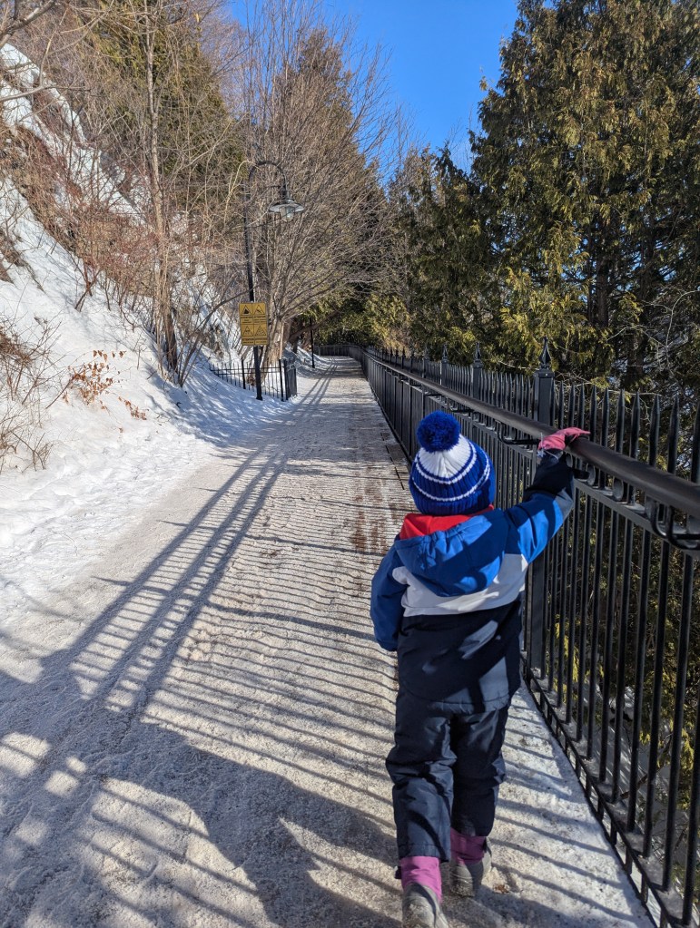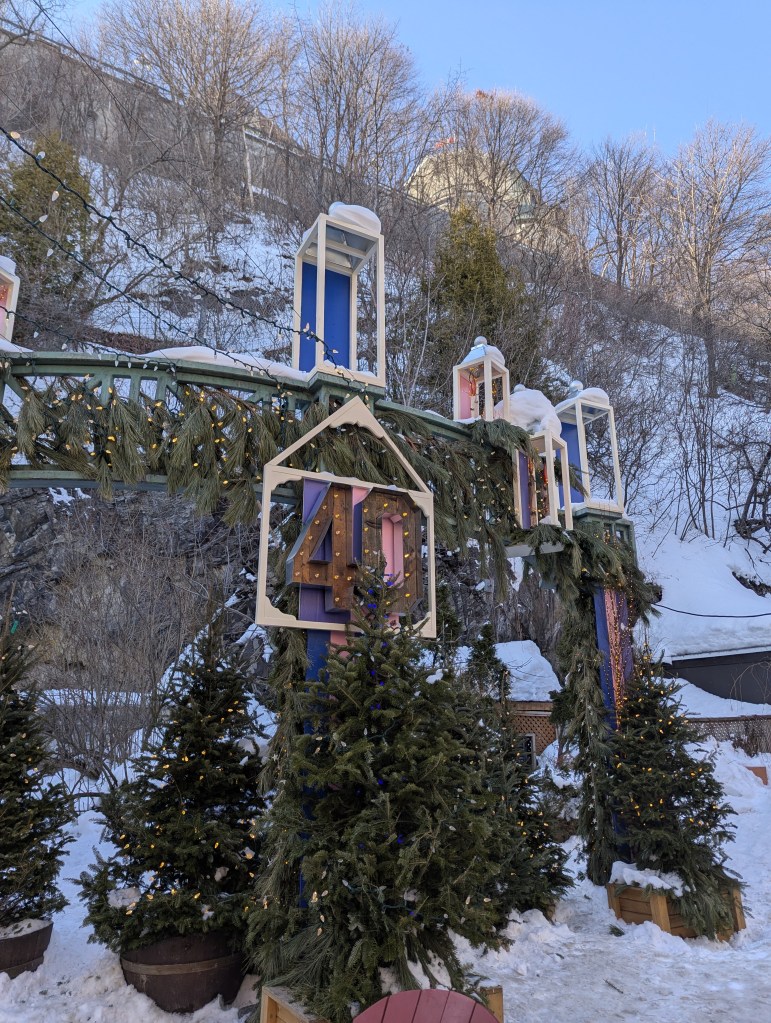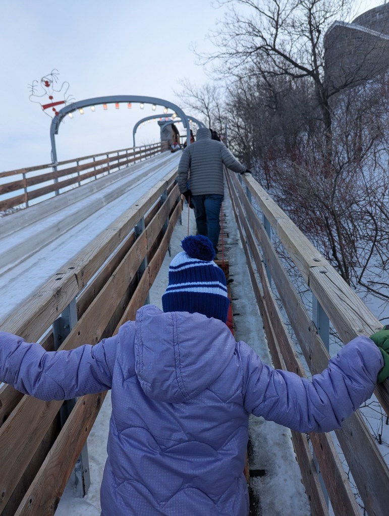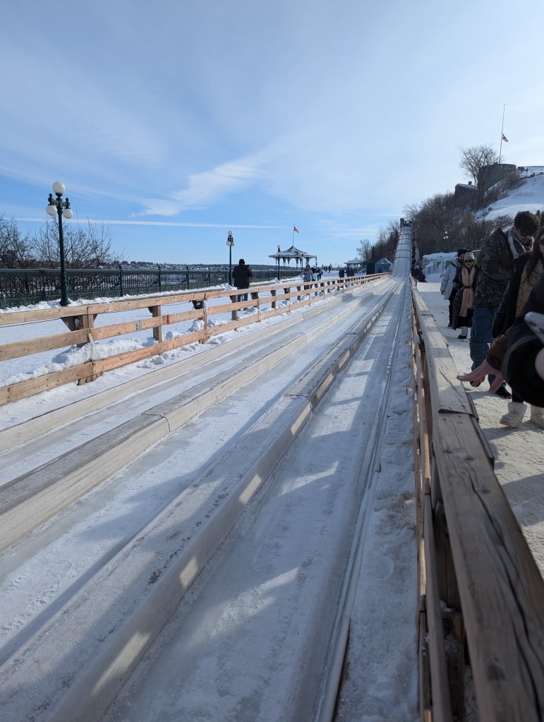 We took the afternoon to walk around Old Quebec, checking out the decorations and small fire pit areas, left over from the Winter Carnival (and posed with the Bonhomme de Neige!). And then we headed over to the base of the Fairmont Chateau Frontenac to ride the Toboggan! This was on the top of my must-do list. David and I both carried up the sled; he rode down with Lincoln and I was with Eleanor. I wanted to take a video of going down, but we were going really fast! It was a lot of fun and I’m so glad we didn’t have to wait hours to get on (only about a 30-minute wait).