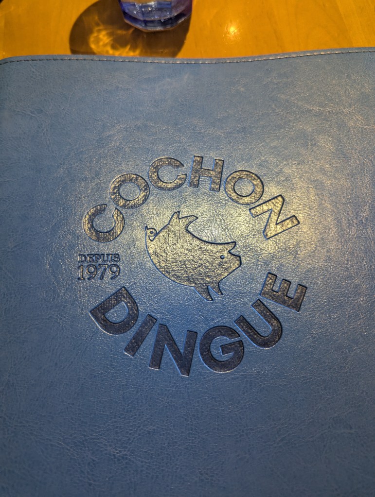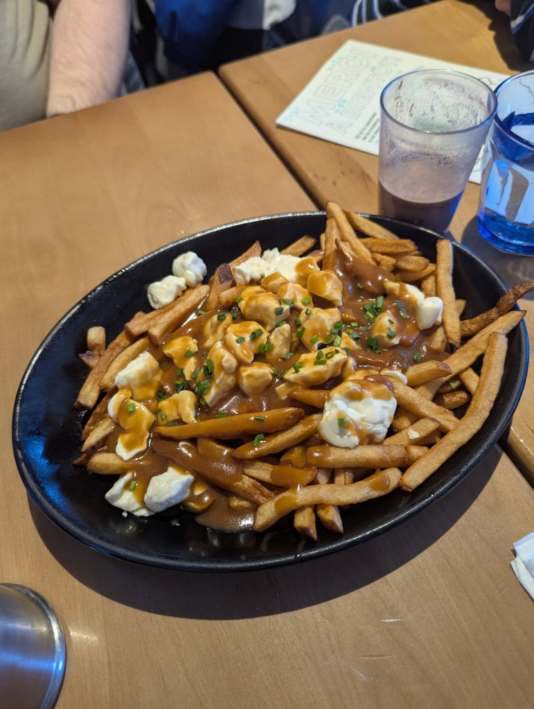 After the falls, we drove to Old Quebec for lunch. Lucky for us, the parking lot I found online was right across the street from the restaurant I wanted to go to (I remember going here on past trips): Cochon Dingue (Crazy Pig). To start, we absolutely had to try the poutine. Even the kids enjoyed it! I also had this incredible latte and for lunch I had the maple pork chops.