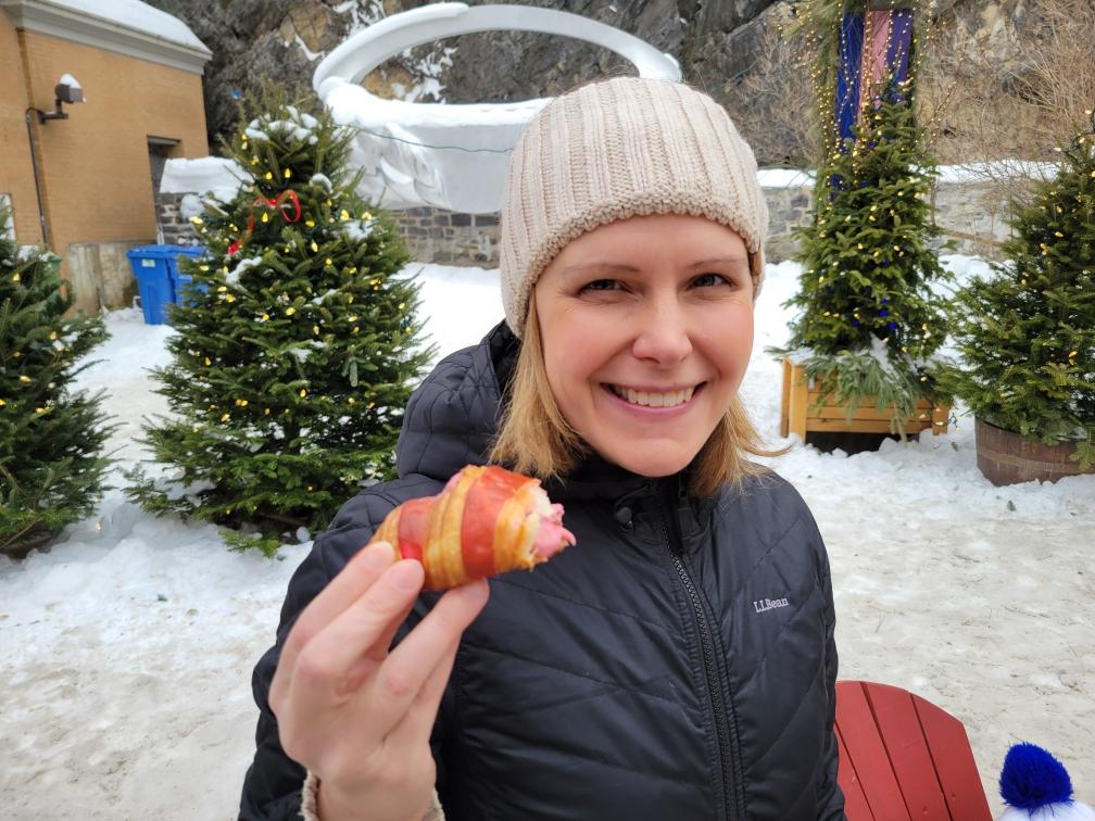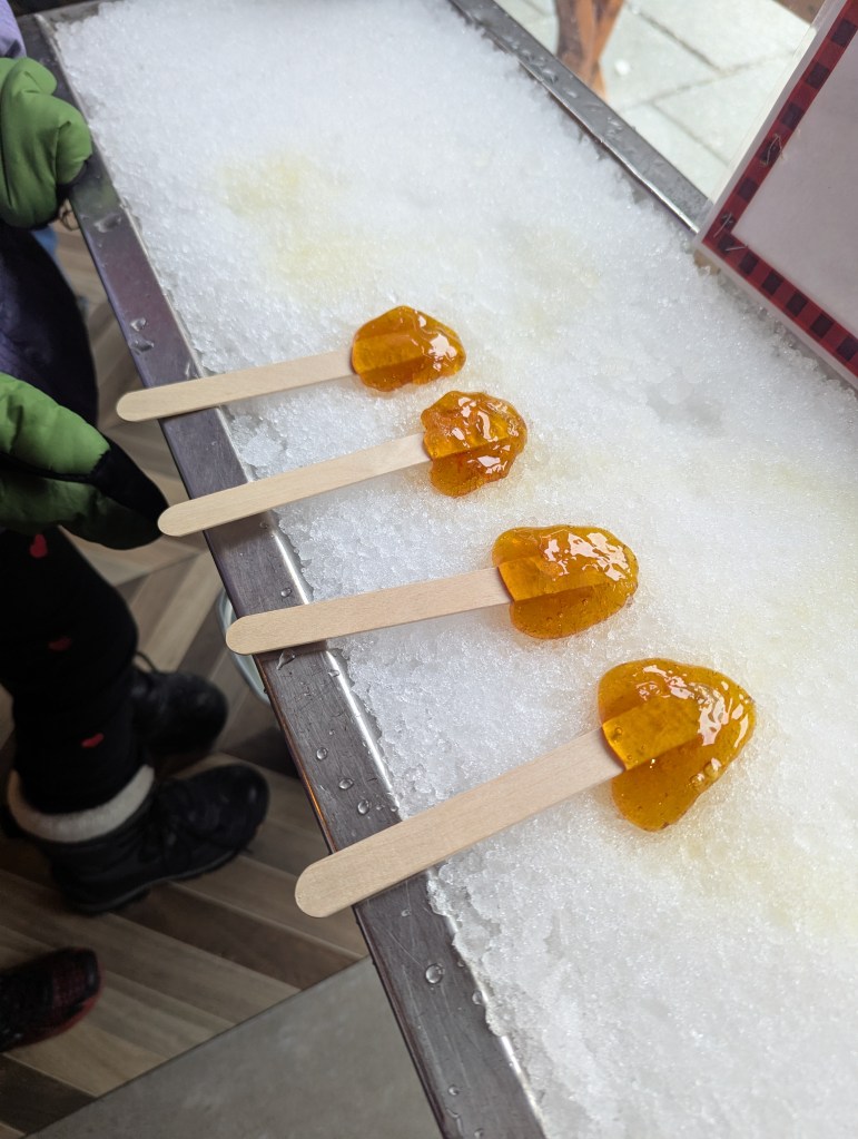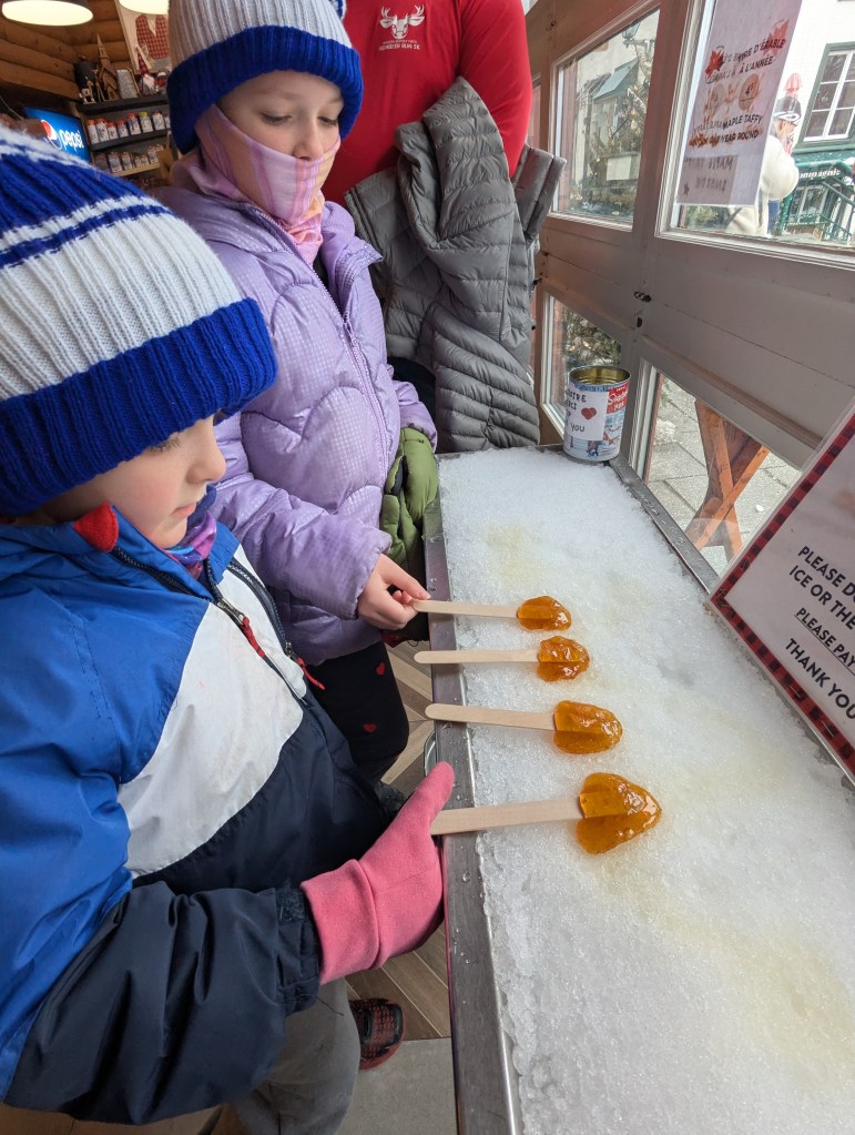 On Monday afternoon, I stopped by a bakery that was recommended (Le Petit Dep), but unfortunately they had sold out of most of their pastries. They told me to get there no later than 10AM and I should be able to get something. So on Tuesday, we were there by 9AM! We shared a raspberry and a chocolate croissant. We also went to a store that did boiled maple syrup in the snow.